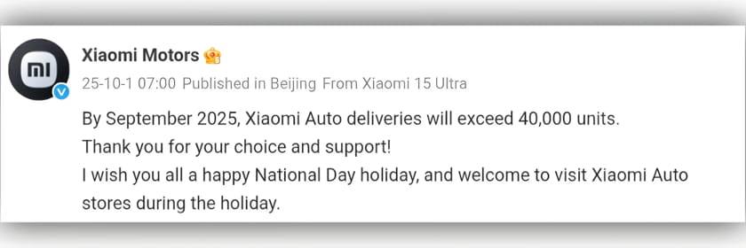 Η Xiaomi Auto έφτασε σε ένα σημαντικό ορόσημο στη νεαρή ιστορία της, καθώς η εταιρεία ανακοίνωσε επίσημα ότι οι μηνιαίες παραδόσεις κατά τον Σεπτέμβριο του 2025 ξεπέρασαν τις 40.000 μονάδες