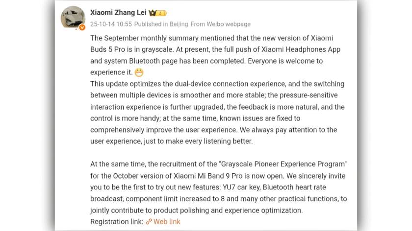 Παράλληλα με την ενημέρωση στο Buds 5 Pro, η Xiaomi ξεκίνησε επίσημα τις “προσλήψει”ς για το “Grayscale Pioneer Experience Program” του Οκτωβρίου για το Xiaomi Band 9 Pro. Αυτή η πρωτοβουλία πρώιμης πρόσβασης δίνει στους χρήστες την ευκαιρία να δοκιμάσουν τις επερχόμενες λειτουργίες πριν από την πλήρη δημόσια διάθεση.