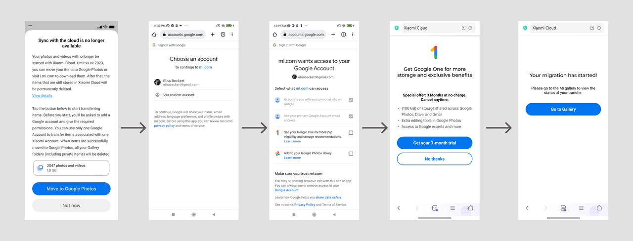 Μπορείτε να επιλέξετε να μεταφέρετε με ασφάλεια τα δεδομένα του Gallery που είναι αποθηκευμένα στο Xiaomi Cloud στο Google Photos και μπορείτε να συνεχίσετε να χρησιμοποιείτε τη λειτουργία δημιουργίας αντιγράφων ασφαλείας φωτογραφιών χρησιμοποιώντας το Google Photos. Η μετεγκατάσταση δεδομένων θα υποστηρίζεται μόνο μέχρι τις XX, XX, 2023, μετά την οποία η αυτόματη μεταφορά σταδιακά δεν θα είναι διαθέσιμη. Το Google Photos προσφέρει 15 GB αποθηκευτικού χώρου, ο οποίος είναι κοινόχρηστος στο Google Photos, το Gmail και το Google Drive. Για τους χρήστες που χρειάζονται επιπλέον χώρο αποθήκευσης στο cloud για να μετακινήσουν το περιεχόμενό τους στο Xiaomi Cloud στις Φωτογραφίες Google, οι χρήστες μπορούν να επωφεληθούν από την πληρωμή συνδρομής στο Google One.