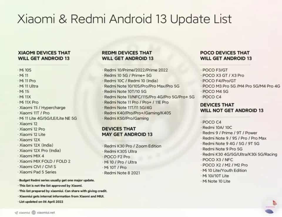 Παρακάτω ακολουθεί μια λίστα με όλες τις συσκευές της Xiaomi που είναι κατάλληλες για την ενημέρωση στο Android 13. Να σημειώσουμε σε αυτό το σημείο πως η παρακάτω λίστα είναι εντελώς ανεπίσημη και έχει συνταχθεί από το xiaomiui.net