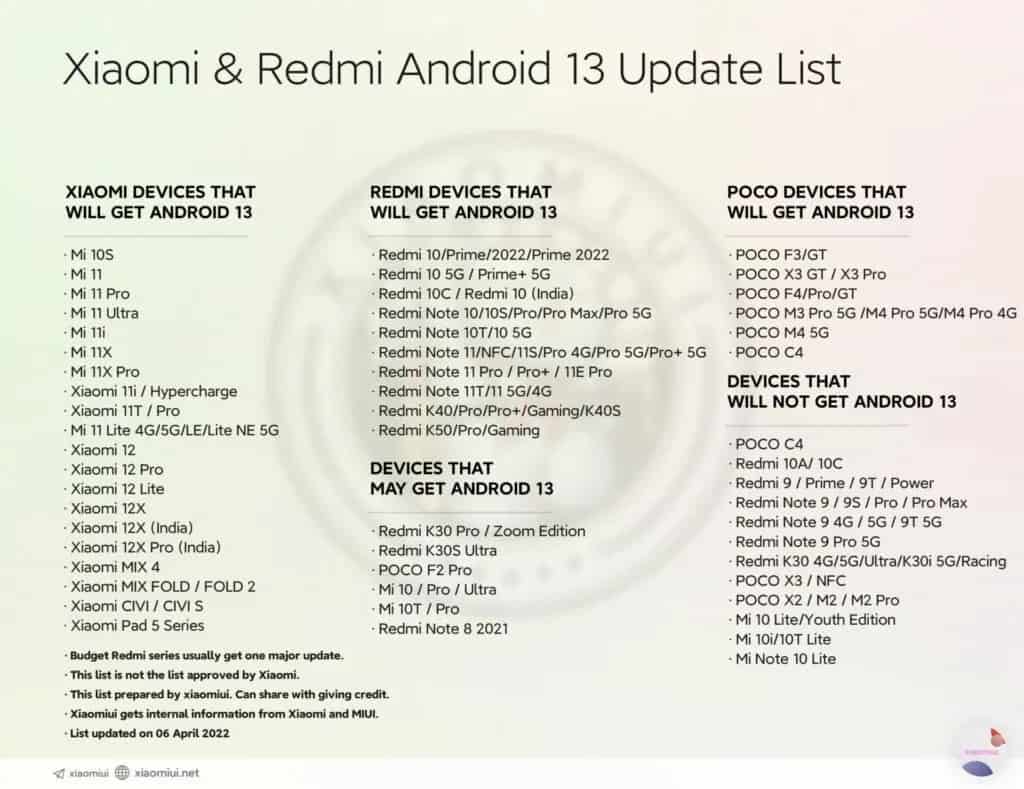 Η Xiaomi δεν έχει κυκλοφορήσει ακόμη μια επίσημη λίστα ενημέρωσης για το Android 13 και για τα μοντέλα που θα λαμβάνουν την ενημέρωση. Ωστόσο, με βάση την προηγούμενη εμπειρία, μπορούμε να πούμε με ασφάλεια ότι οι σειρές Xiaomi 12, Xiaomi 12 Pro και Redmi K50 θα είναι από τις πρώτες που θα λάβουν την ενημέρωση. Η Xiaomi τείνει να κυκλοφορεί πρώτα σημαντικές ενημερώσεις για τα κορυφαία μοντέλα της και στη συνέχεια να τις κυκλοφορεί σε άλλα μοντέλα με την πάροδο του χρόνου.