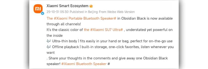 Η Xiaomi κυκλοφόρησε επίσημα ένα νέο χρώμα για το φορητό Bluetooth ηχείο της — το Obsidian Black, που περιγράφεται ως το κλασικό χρώμα του Xiaomi SU7 Ultra