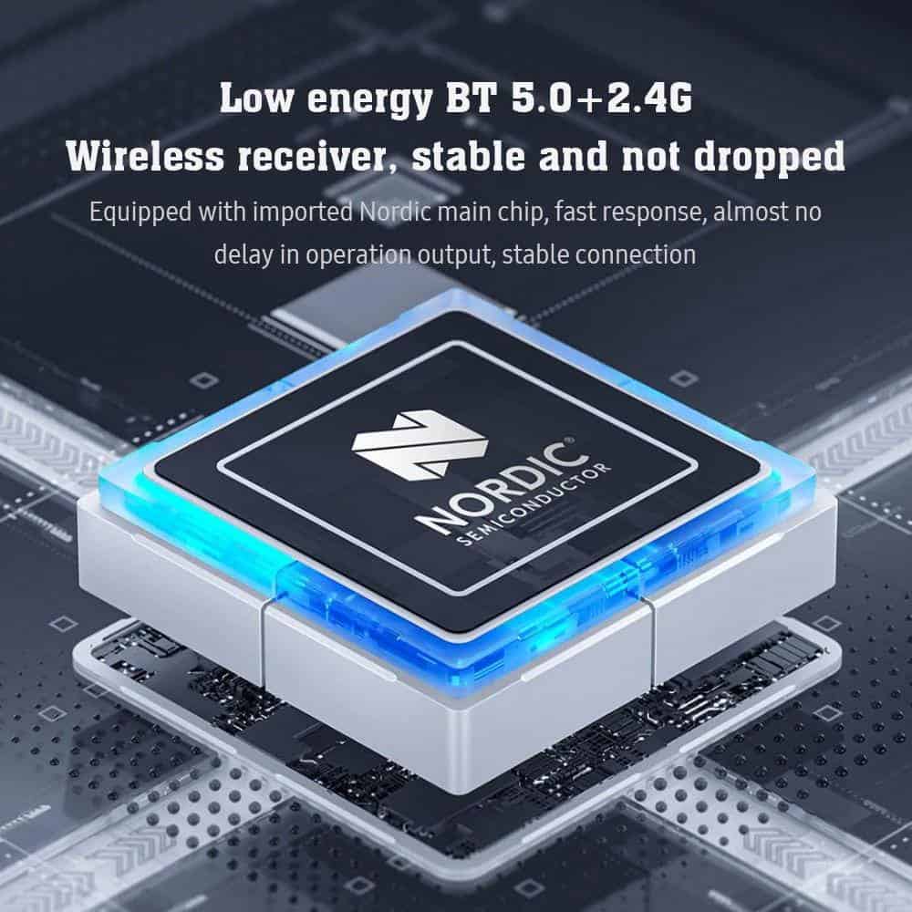 Χαμηλής ενέργειας BT 5.0 + 2.4G : Είναι εξοπλισμένο με BlueTooth τσιπ 5.0 της Nordic, που προσφέρει γρήγορη απόκριση, σχεδόν χωρίς καμία καθυστέρηση στην έξοδο λειτουργίας, αλλά και σταθερή σύνδεση.