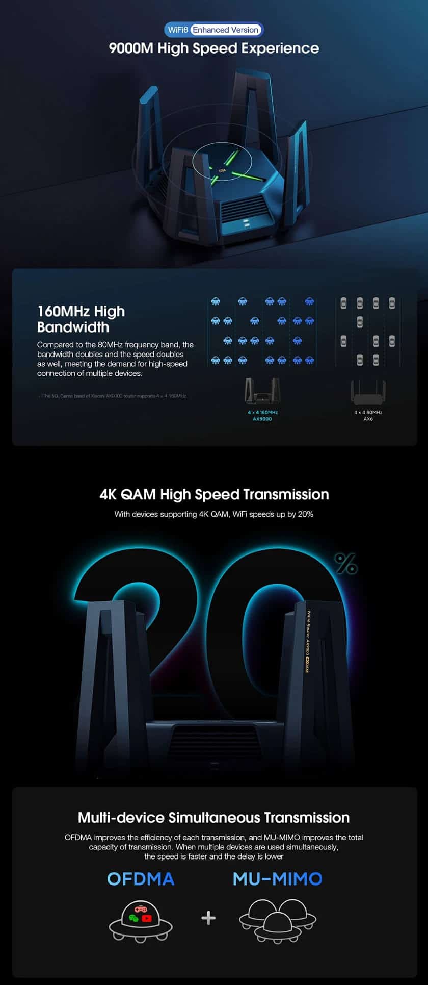 Αυτός είναι ο πρώτος δρομολογητής με υποστήριξη της μπάντας Wi-Fi 6 που είχε κυκλοφορήσει η Xiaomi στην Κίνα. Διαθέτει συνολικά 12 εξωτερικές κεραίες που καλύπτουν τη ζώνη 2,4 GHz (έως 1,148 Mbps εύρους ζώνης) και δύο ζώνες στα 5 GHz (4,804 Mbps + 2,402 Mbps), μία εκ των οποίων είναι ειδικά αφιερωμένη στο gaming, έτσι ώστε όλες οι άλλες συσκευές που είναι συνδεδεμένες στο ίδιο WiFi δίκτυο να μην επηρεάζουν την απόδοση στο Gaming.