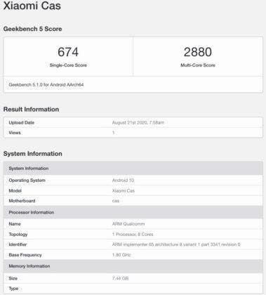 Όπως βλέπουμε από την σελίδα αναφοράς στο GeekBench, αυτή η συσκευή “τρέχει” προφανώς κάποια έκδοση του MIUI που βασίζεται στο Android 10, και πέτυχε βαθμολογία 674 πόντων στις δοκιμές ενός πυρήνα και 2880 στις δοκιμές πολλαπλών πυρήνων. Επιπλέον, από τον πηγαίο κώδικα του MIUI έχει ανακαλυφθεί ότι αυτή η συσκευή με την κωδική ονομασία “Cas”, θα έρθει με Adreno 650 GPU, και αυτό ενισχύει τις φήμες ότι θα τροφοδοτείται τελικά από το SD865 SoC.