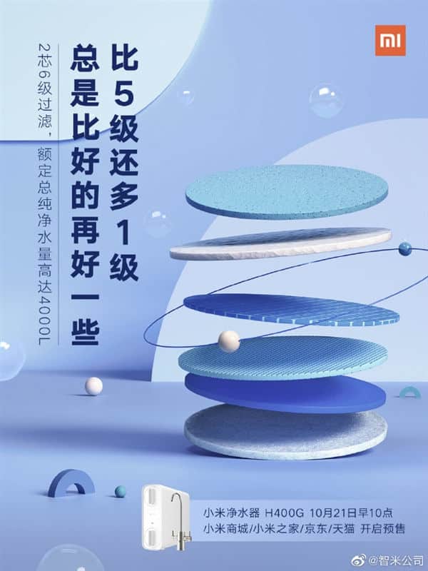 Εχθές, η Xiaomi κάτω από το Brand name Zhimi (SmartMi), ανακοίνωσε ότι το νέο φίλτρο νερού Mi Water Purifier H400G, θα κυκλοφορήσει στην αγορά της Κίνας στις 21 Οκτωβρίου. Το μεγαλύτερο χαρακτηριστικό του νέου προϊόντος είναι η χρήση διήθησης διπλού φίλτρου 6 σταδίων.