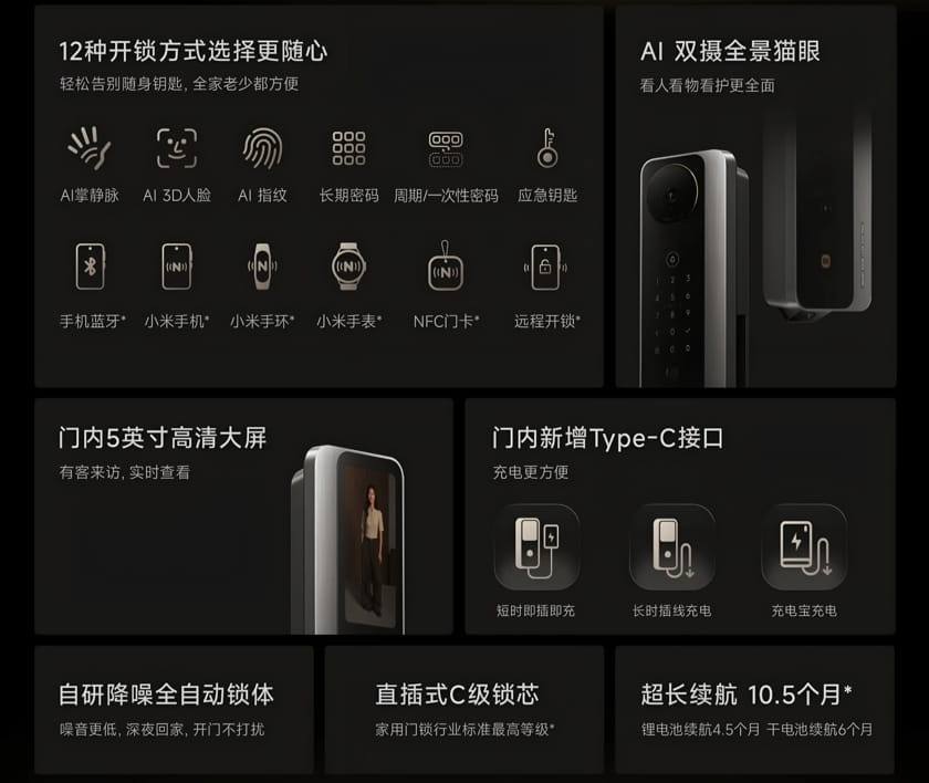 Αυτή η έξυπνη κλειδαριά της Xiaomi διαθέτει κύλινδρο κλειδαριάς επιπέδου C, ο οποίος λέγεται ότι λειτουργεί σχετικά αθόρυβα. Επιπλέον, η συσκευή παρέχει αυτονομία για περίπου έξι μήνες με την χρήση της ενσωματωμένης μπαταρίας λιθίου στα 8,000 mAh και τις τέσσερις μπαταρίες AA.