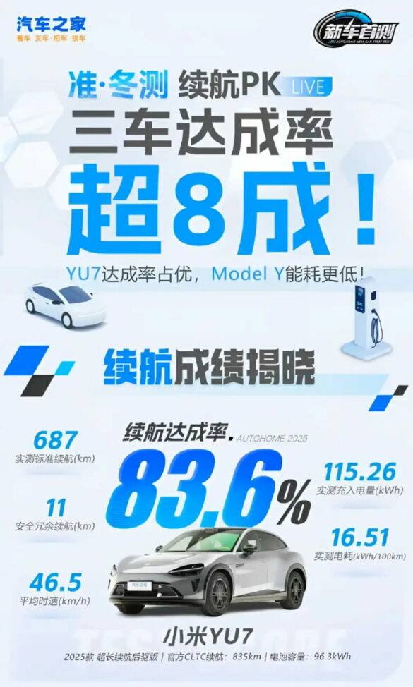 Το Autohome δημοσίευσε τα αποτελέσματα από την τελευταία δοκιμή χειμερινής αντοχής, συγκρίνοντας τα Xiaomi YU7, Tesla Model Y και Ideal i6 σε πραγματικές συνθήκες κρύου καιρού