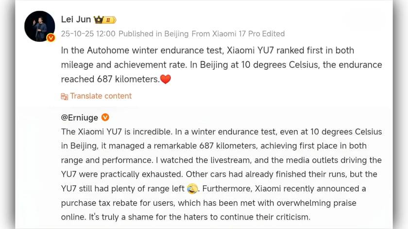 Τα αποτελέσματα υπογραμμίζουν την εντυπωσιακή ενεργειακή απόδοση και την αντοχή του Xiaomi YU7 στο κρύο, σηματοδοτώντας ισχυρή διαχείριση της μπαταρίας και την βελτιστοποίηση του συστήματος. Για ένα ηλεκτρικό όχημα πρώτης γενιάς, αυτή η απόδοση τοποθετεί την Xiaomi σε άμεσο ανταγωνισμό με κορυφαίες EV μάρκες σε παγκόσμιο επίπεδο.