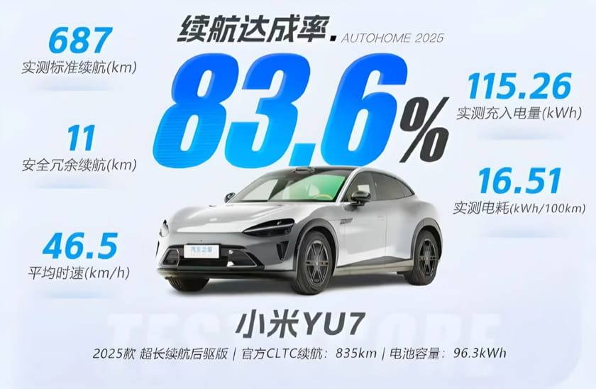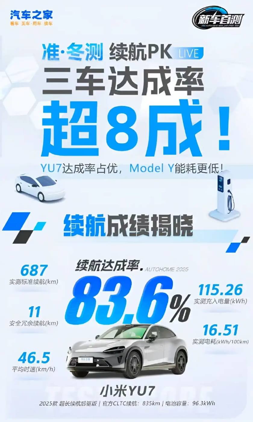 Στη δοκιμή χαμηλής θερμοκρασίας, το Xiaomi YU7 πέτυχε ποσοστό αντοχής 83.6%, ξεπερνώντας το Tesla Model Y με 81.9% και το Ideal i6 που πέτυχε ποσοστό αντοχής στο 82%. Συγκεκριμένα, το YU7 της Xiaomi κάλυψε συνολικά 687 km σε σχέση με την ονομαστική αυτονομία των 835 km — δηλαδή 200 km περισσότερα από το Model Y της Tesla, το οποίο κατάφερε να διανύσει μόλις 469.8 km.
