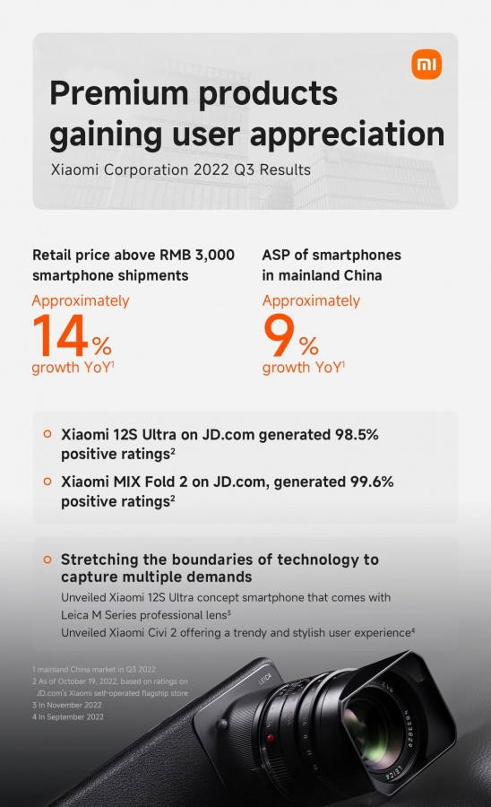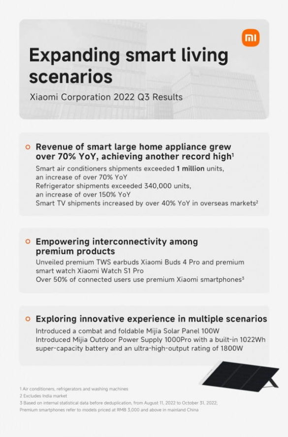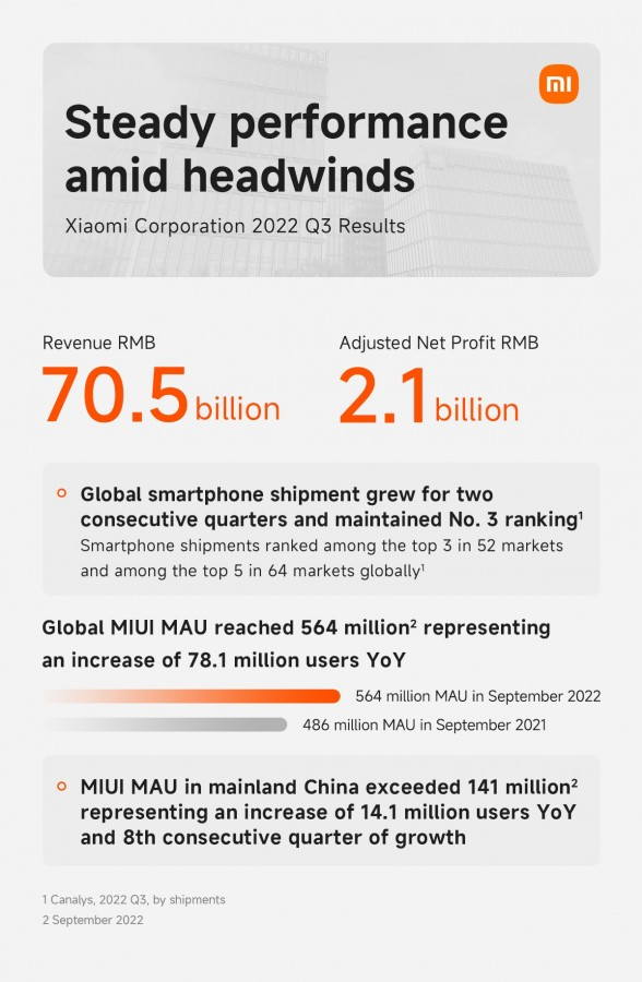 Η εταιρεία πούλησε 40,5 εκατομμύρια smartphone κατά το τρίτο τρίμηνο του 2022, και ενώ διατήρησε την 3η θέση στον κόσμο, οι αποστολές σε Smartphone μειώθηκαν κατά 7,8% ετησίως, με αντίστοιχη μείωση κατά 11,1% στα έσοδα της εταιρείας. Η Xiaomi αποδίδει τα αρνητικά αποτελέσματα στις αντίξοες συνθήκες της «παγκόσμιας μακροοικονομίας», αν και ενίσχυσε επίσης τις προσπάθειες προώθησης στις αγορές του εξωτερικού.