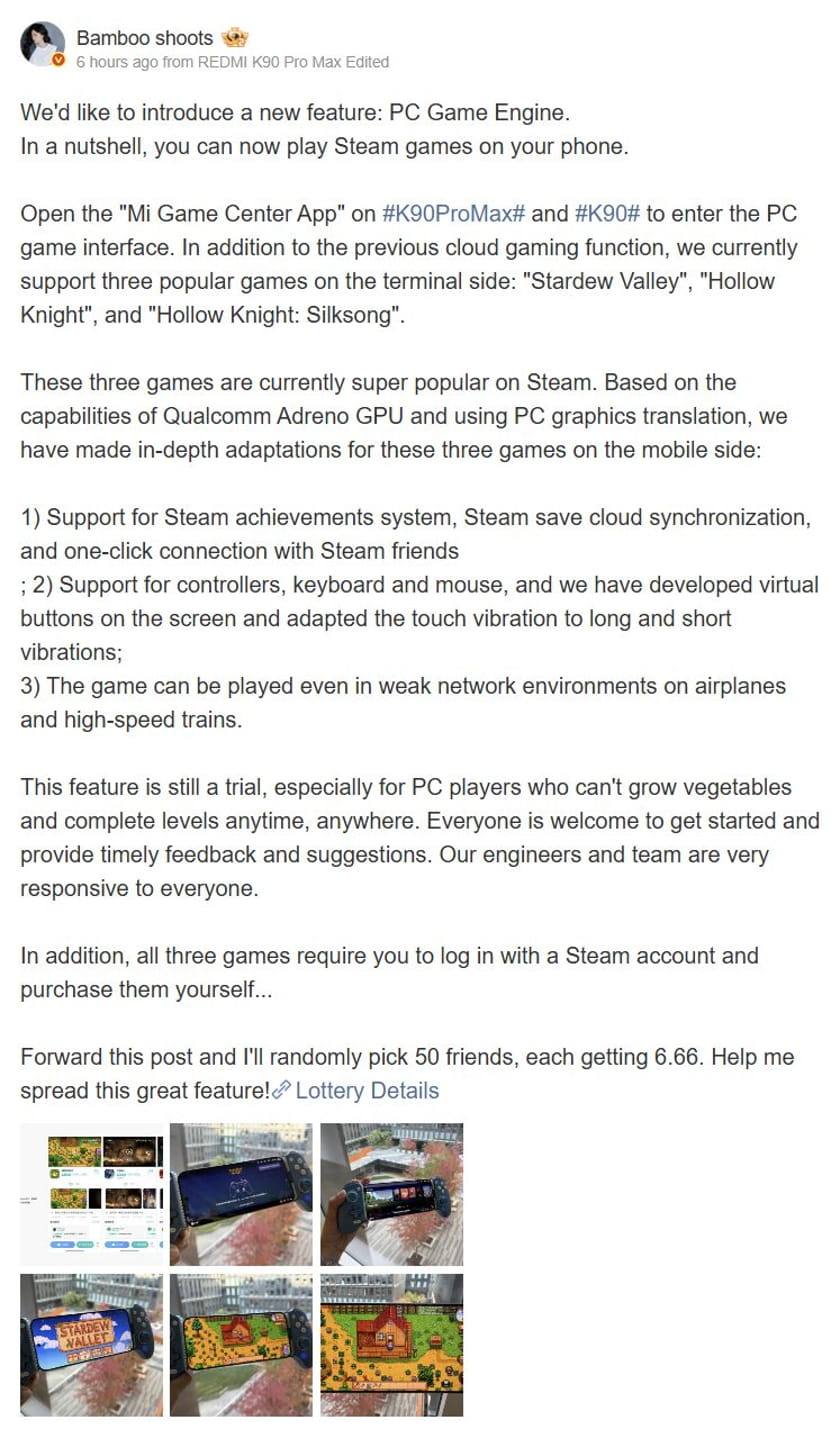 Σύμφωνα με την τελευταία δήλωση του Διευθυντή Προϊόντων της REDMI, Sun Cun, αποκαλύφθηκε ότι τα νέα smartphone REDMI K90 και REDMI K90 Pro Max είναι εξοπλισμένα με μια νέα Game Engine που υποστηρίζει το Steam στα Smartphone, επιτρέποντας στους χρήστες να εκτελούν από το Steam απευθείας στα smartphone τους.